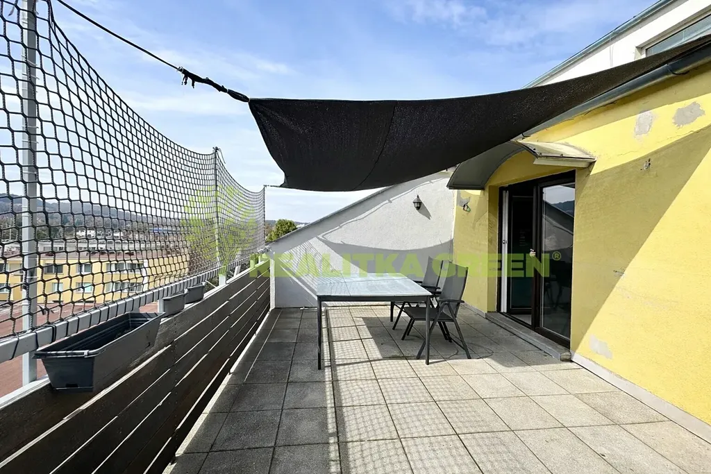 Dominantou bytu je prostorná terasa situovaná do zeleně, která nabízí naprosté soukromí – jste doslova v korunách stromů, bez rušivých pohledů okolí. Na terasu navazuje zimní zahrada s nádherným výhledem na řeku Dřevnici, ideální jako jídelna nebo relaxační kout.