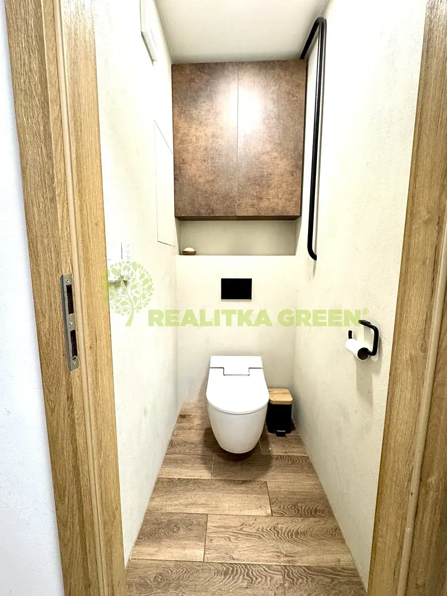 Koupelna a WC jsou řešeny v moderním stylu s důrazem na komfort – podlahové vytápění, walk-in sprchový kout Hansgrohe a toaleta Duravit s integrovaným bidetem na dálkové ovládání.