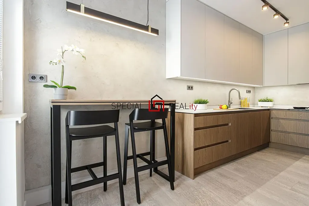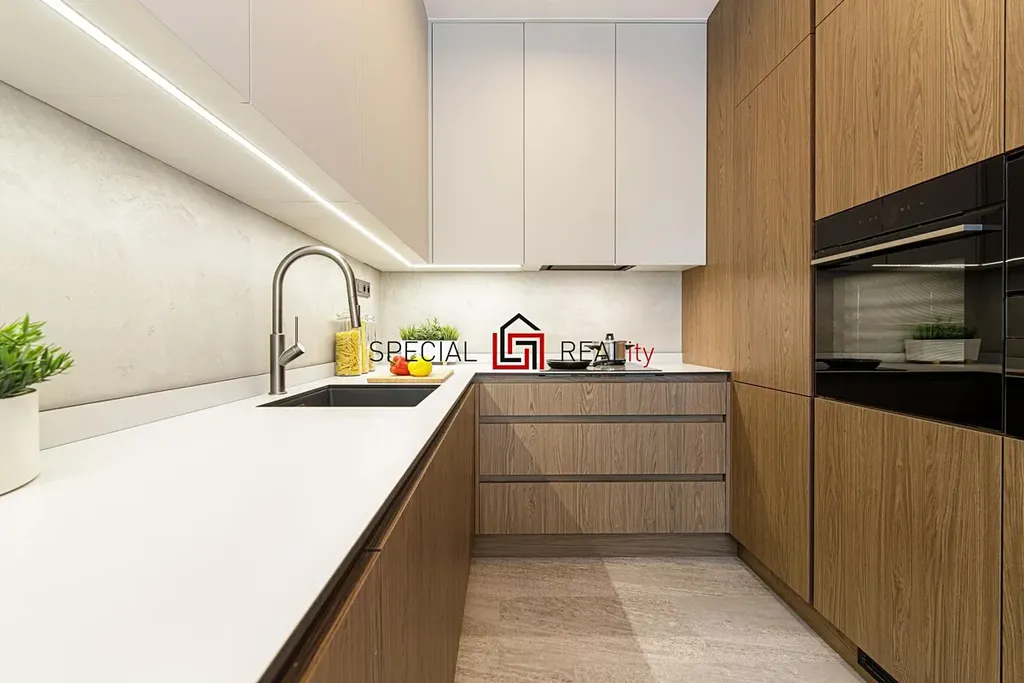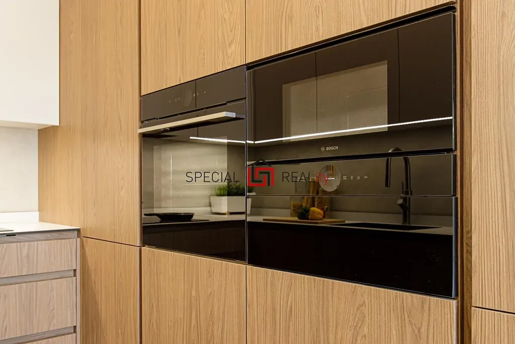 Byt je vybaven zcela novou kuchyňskou linkou na míru se spotřebiči značek Bosch.