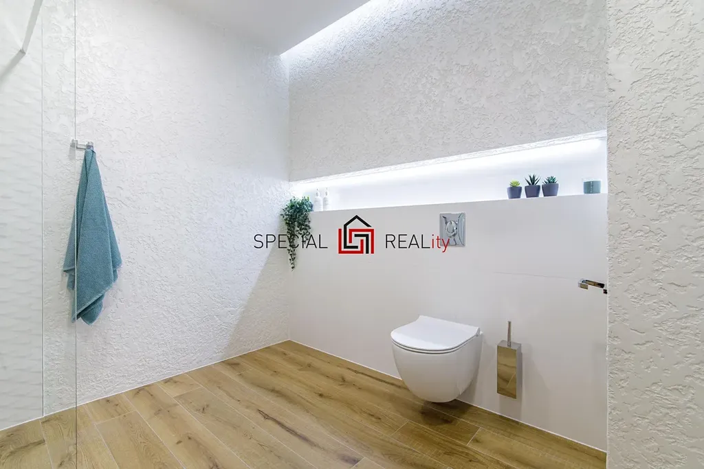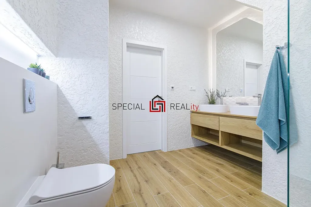 V koupelně se nachází sprchový kout (walk-in), designové dvoj umyvadlo a toaleta.
