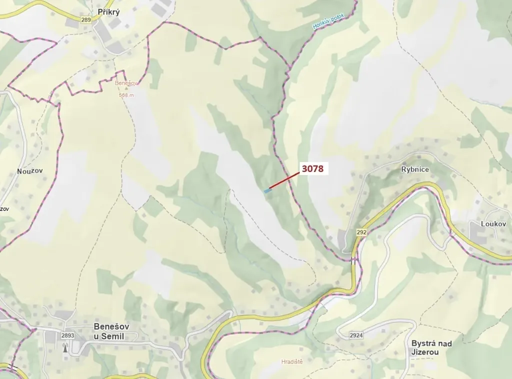 Lesní pozemek o výměře 1110 m2, parcelní číslo 3078, podíl 1/1, katastrální území Benešov u Semil, obec Benešov u Semil, obec s rozšířenou působností Semily, okres Semily, Liberecký kraj.