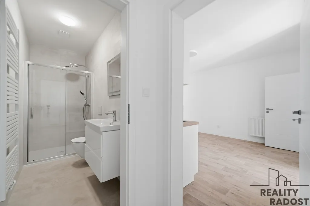 Kuchyňská linka je plně vybavena spotřebiči – indukční varná deska, trouba, mikrovlnná trouba, myčka 60 cm a lednice s mrazákem. Celý byt je proveden v moderním standardu s důrazem na kvalitu materiálů.