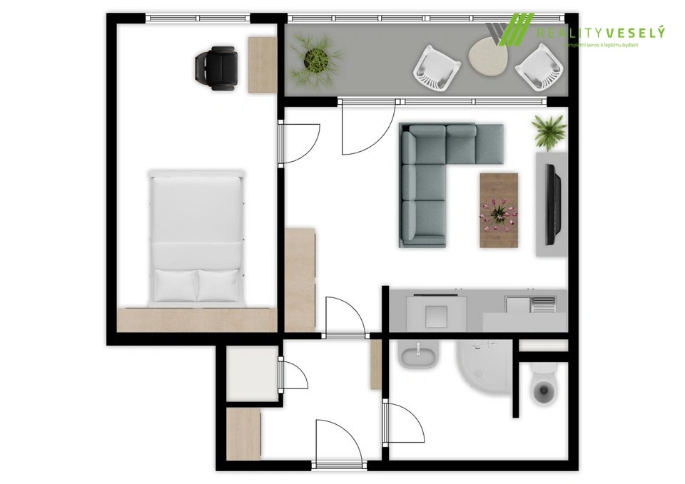 Srdcem bytu je prosvětlený obývací pokoj s kuchyňským koutem. Kuchyňská linka je vybavena vestavnými spotřebiči (varná deska, odsavač par, myčka nádobí, lednice) a plynule navazuje na obývací část. Z tohoto prostoru se vstupuje na zmíněnou lodžii, která díky svému celoprosklenému provedení může sloužit jako zimní zahrada či místo pro relaxaci po celý rok. O tepelnou pohodu a příjemné klima se i v letních měsících stará instalovaná klimatizační jednotka. Z obývacího pokoje je pak přístupná samostatná ložnice.