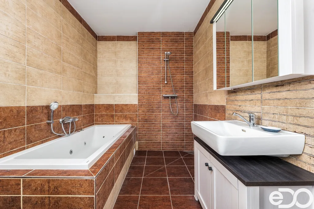 Vytápění je zajištěno elektrickým bojlerem a podlahovým topením.