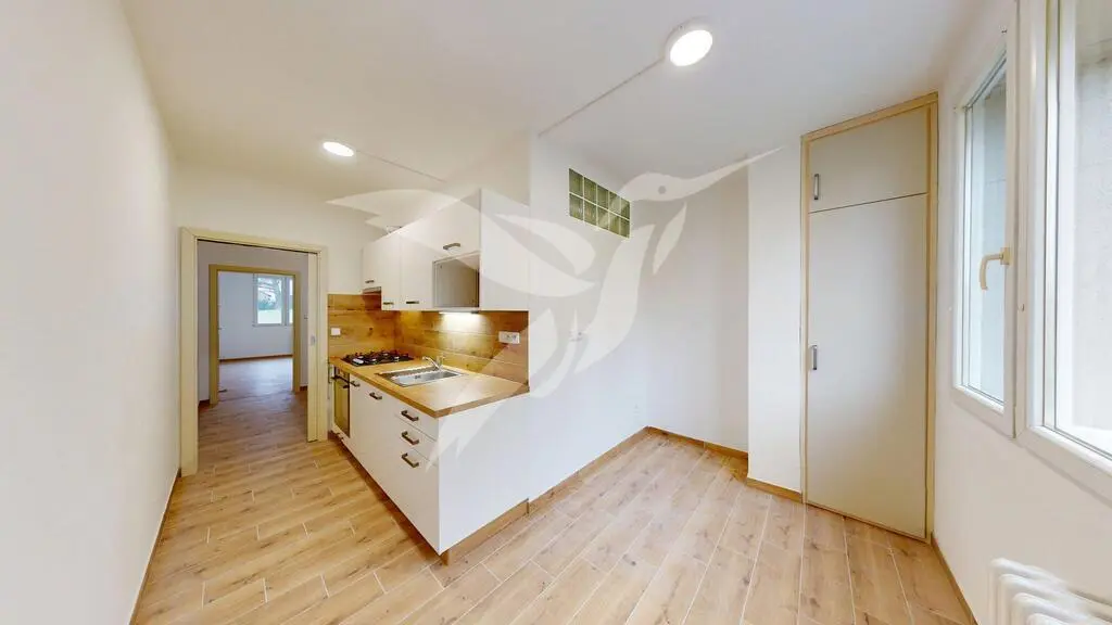 Nemovitost o velikosti 45 m2 se nachází v 1. NP panelového bytového domu bez výtahu a skládá se z předsíně, pokoje včetně kuchyňské linky, samostatného pokoje, koupelny s toaletou a k bytu náleží i sklepní kóje situovaná v suterénu bytového domu. Bytová jednotka se pronajímá jako nezařízená a její součásti je kuchyňská linka se spotřebiči (elektrická trouba, plynový sporák + digestoř), dále předsíňová stěna na míru, spižírna. Vytápění a ohřev vody je zajištěn dálkovými dodávkami.