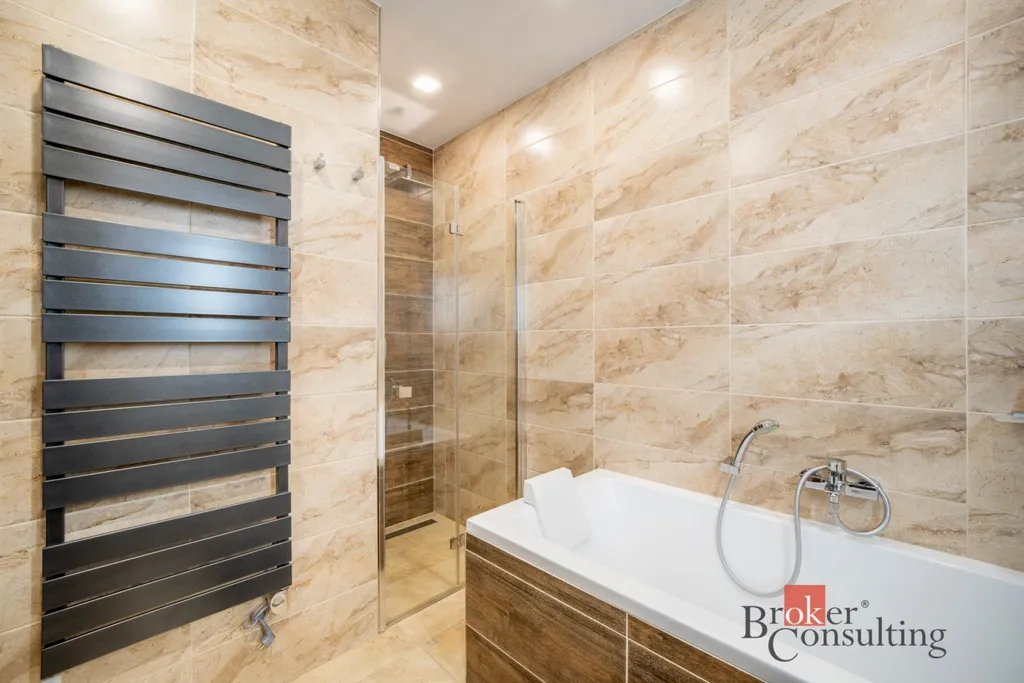 Byt disponuje také koupelnou s vanou a samostatnou toaletou, přičemž pod vanou je připravena elektroinstalace pro případné napojení hydromasážního systému.
