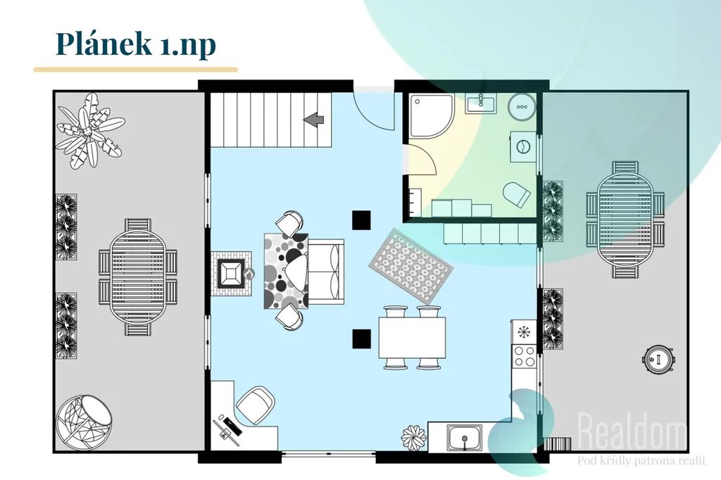Dispozice 4+kk působí vzdušně a útulně zároveň. Velká okna vpouštějí dovnitř denní světlo a propojují interiér se zahradou, kde rostou ovocné stromy a kde najdete dvě terasy i balkon s výhledem, který se prostě neokouká.