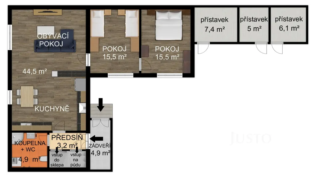 Dům je částečně podsklepený (8 m²) a disponuje také přístupnou půdou, která nabízí další úložný prostor.