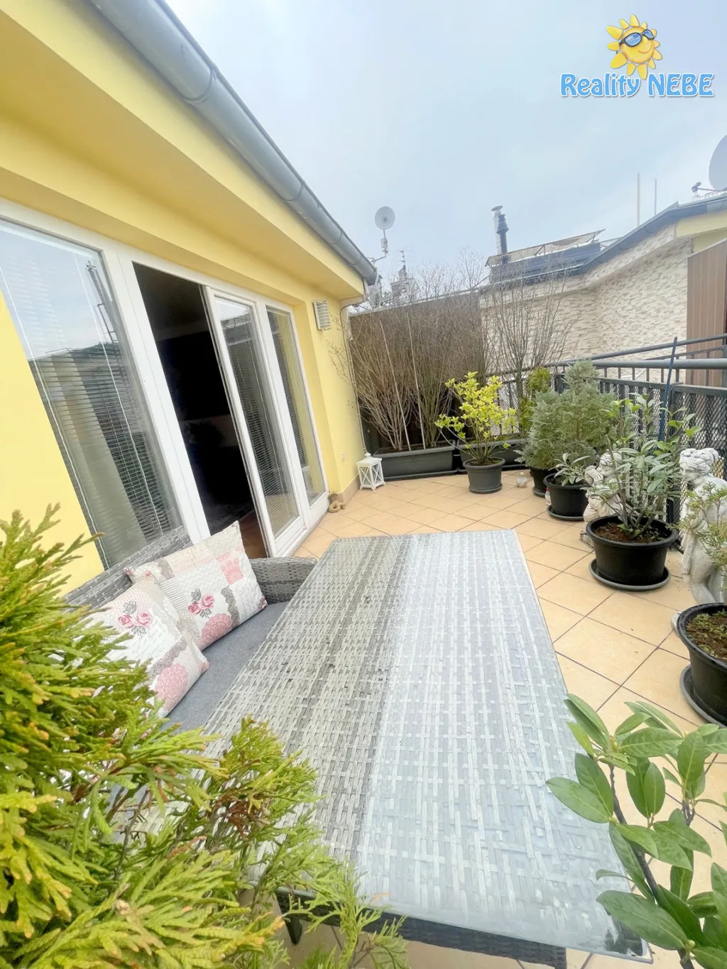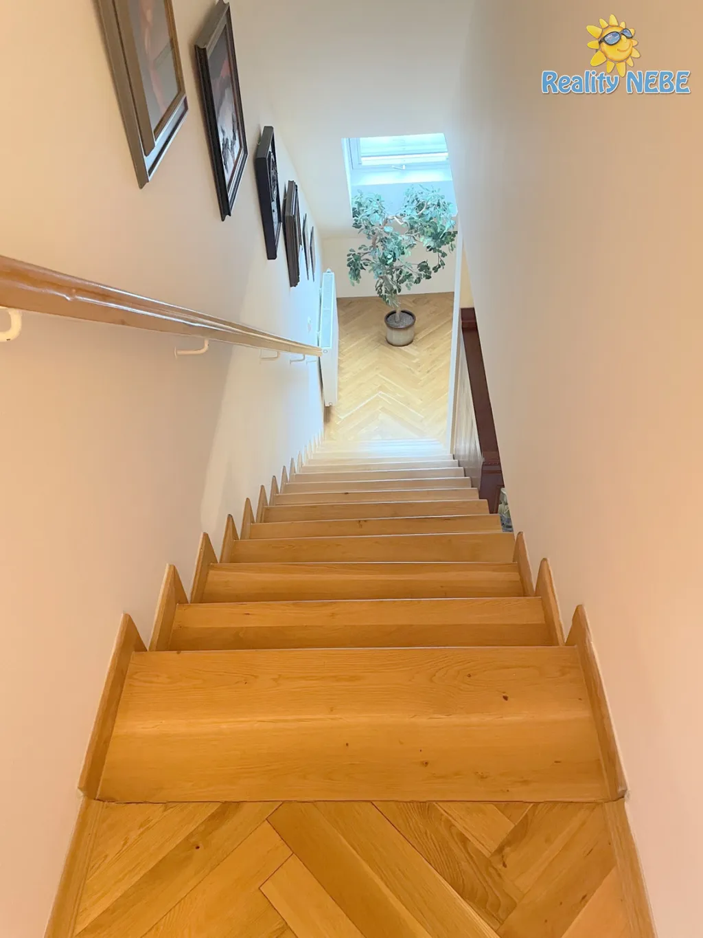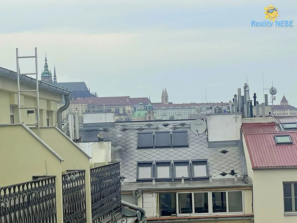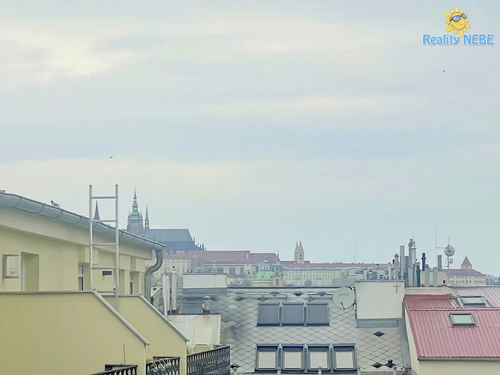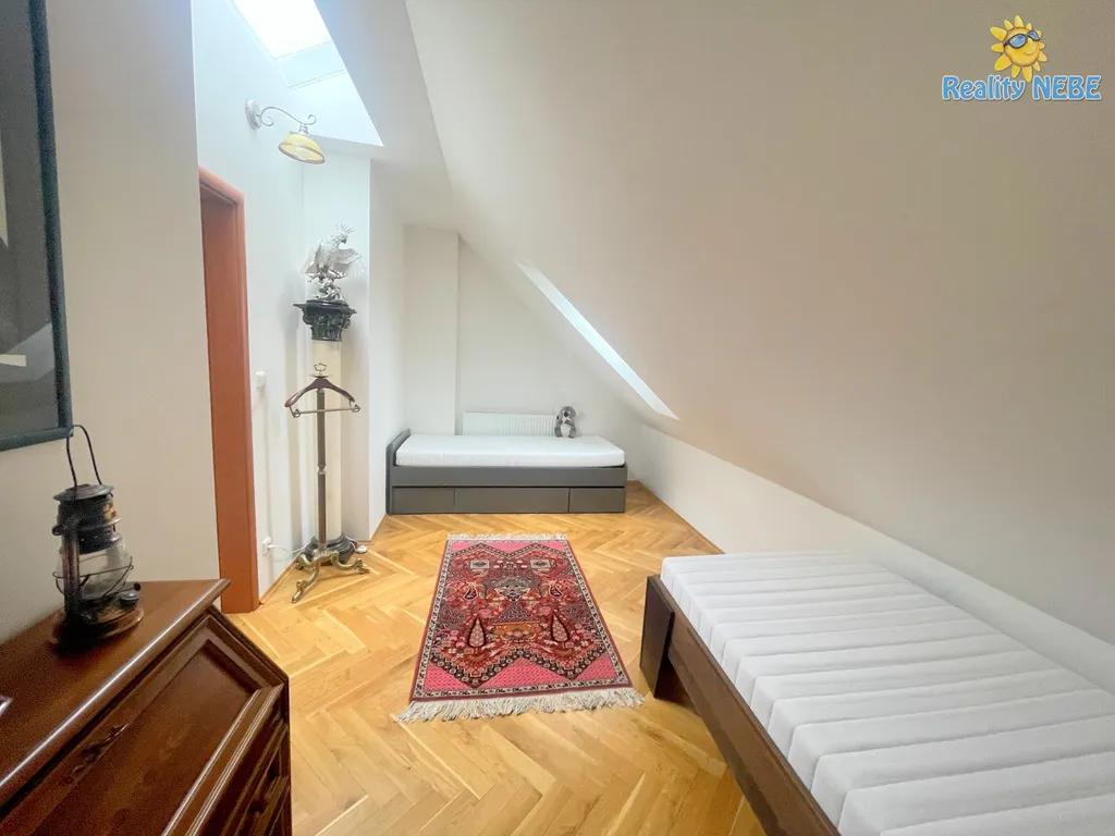 Po schodech nahoru se dostaneme do pokojíku, koupelny s rohovou vanou, sprchou, umyvadlem, toaletou, technické místnosti (kotel Junkers) s pračkou a do prostorné ložnice s manželkou postelí, klimatizací a vstupem na terasu s výhledem na Prahu. V bytě je 2x trezor. Byt je kompletně vybaven, jen vezmete své věci a bydlíte jak na zámku.