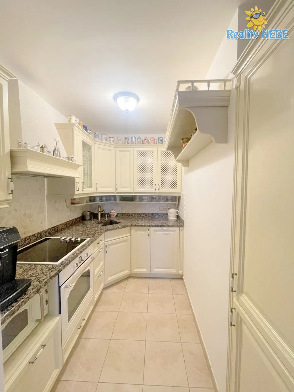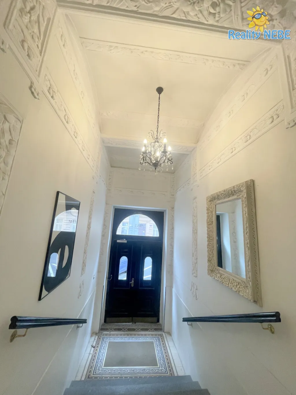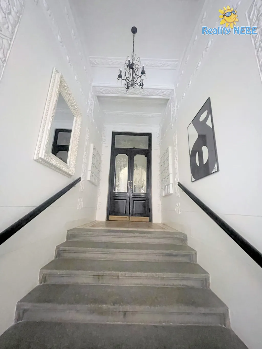 Po schodech nahoru se dostaneme do pokojíku, koupelny s rohovou vanou, sprchou, umyvadlem, toaletou, technické místnosti (kotel Junkers) s pračkou a do prostorné ložnice s manželkou postelí, klimatizací a vstupem na terasu s výhledem na Prahu. V bytě je 2x trezor. Byt je kompletně vybaven, jen vezmete své věci a bydlíte jak na zámku.