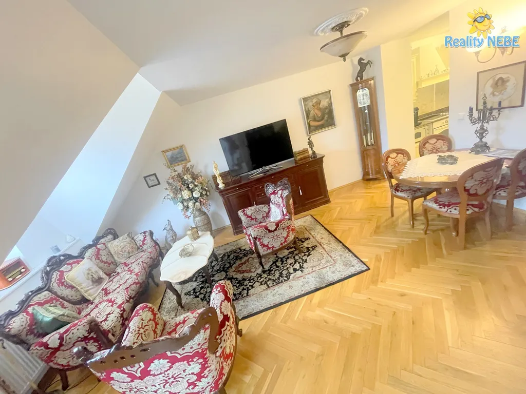 Pronájem luxusního mezonetového bytu 3kk 93m2 s terasou 17m2 v ulici Zborovská Praha 5 Smíchov s výhledem na Prahu. Byt se nachází v 5.patře historického cihlového domu s výtahem. Byt je po rekonstrukci a kompletně zařízen retro stylem. Bezpečnostní dveře nás zavedou do vstupní chodby, kde jsou vestavné zrcadlové skříně, toaleta s umyvadlem. Dále se nám otevře obývací prostor sladěný v retro stylu, na který navazuje i kuchyňský kout s lednicí, mrazákem, sklokeramickou deskou, digestoří, mikrovlnkou, myčkou.