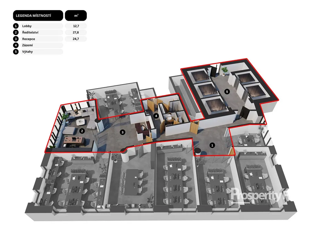 Kancelář je plně klimatizovaná, vybavená žaluziemi a vstup je zajištěn přes čipovou kartu.