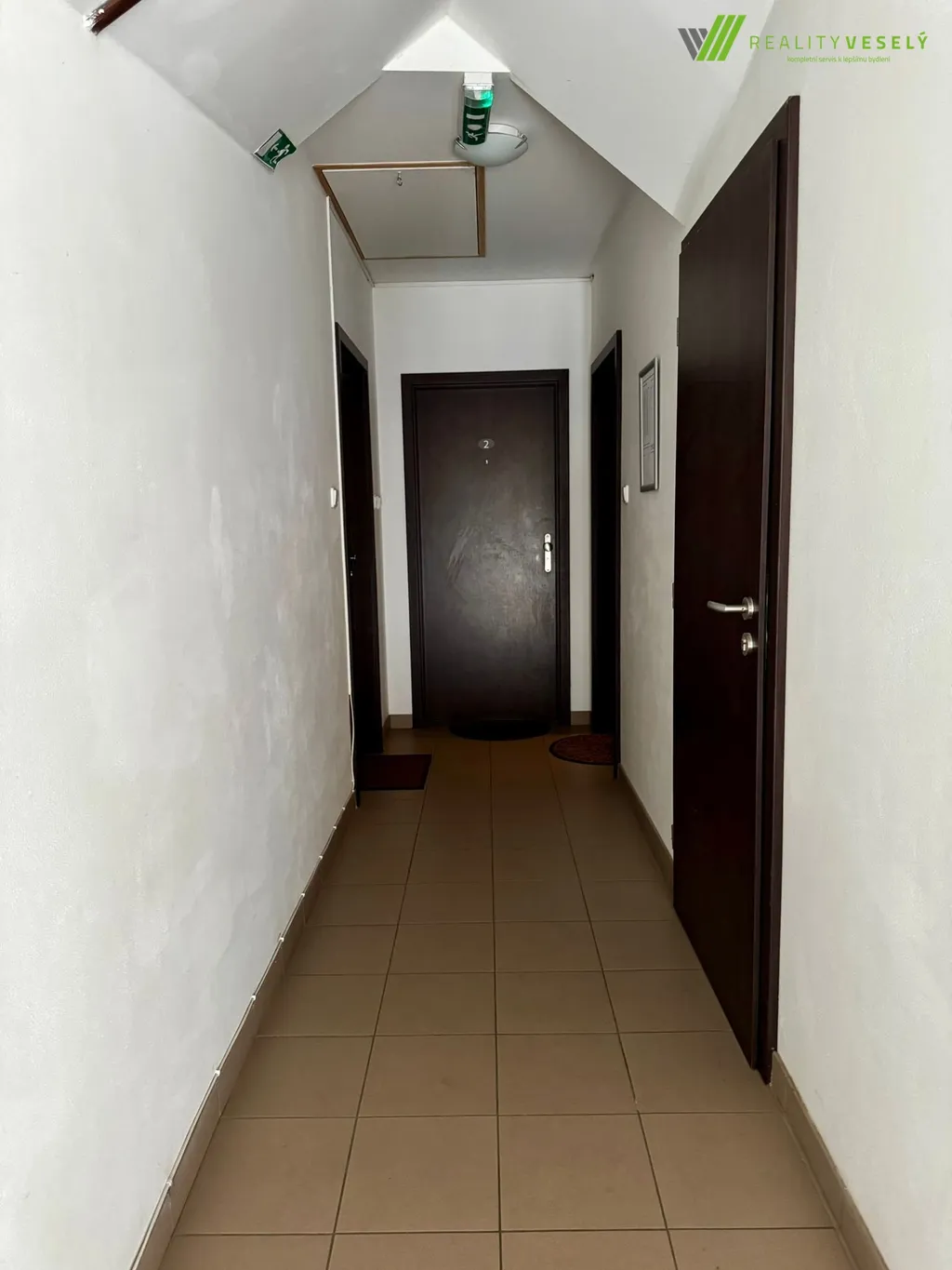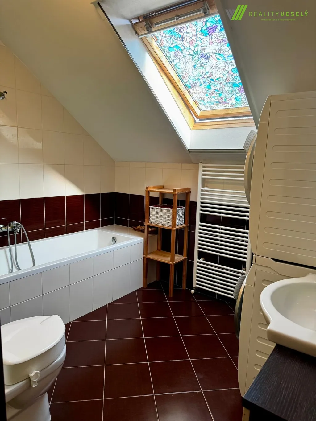 Byt se nachází v posledním patře bytového domu, což zajišťuje dostatek soukromí i příjemnou atmosféru podkroví. Dominantou je prostorný obývací pokoj s kuchyňským koutem, který je díky střešním oknům krásně prosvětlený. Kuchyňská linka je moderní a prakticky řešená, včetně vestavěných spotřebičů.
