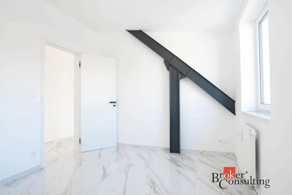 Hlavní částí bytu je velká, prosvětlená obývací místnost propojená s moderní kuchyňskou linkou vybavenou kvalitními spotřebiči. Z obývacího prostoru se vstupuje na soukromou terasu situovanou v horním patře, která poskytuje ideální místo pro relaxaci nebo posezení s přáteli a nabízí krásný výhled na centrum města.