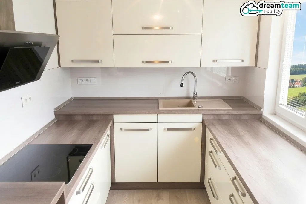 Moderní linka, elektrický sporák s troubou, lednice, digestoř, mikrovlnka a — sláva — myčka nádobí. Haló, konec ručního mytí nádobí! Vše funkční, vše hezky na svém místě.