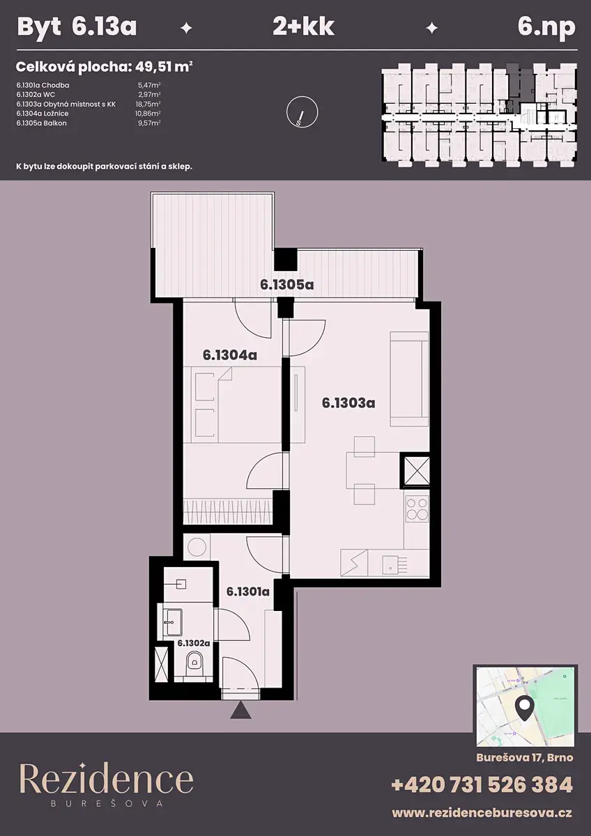 Nabízíme k prodeji moderní byt 2+kk o podlahové ploše 39,50 m2 s balkónem 9,90 m2 nacházející se v námi připravovaném projektu Rezidence Burešova v atraktivní lokalitě Veveří. K bytu lze dokoupit parkovací místo v zakladači i sklepní kóji.