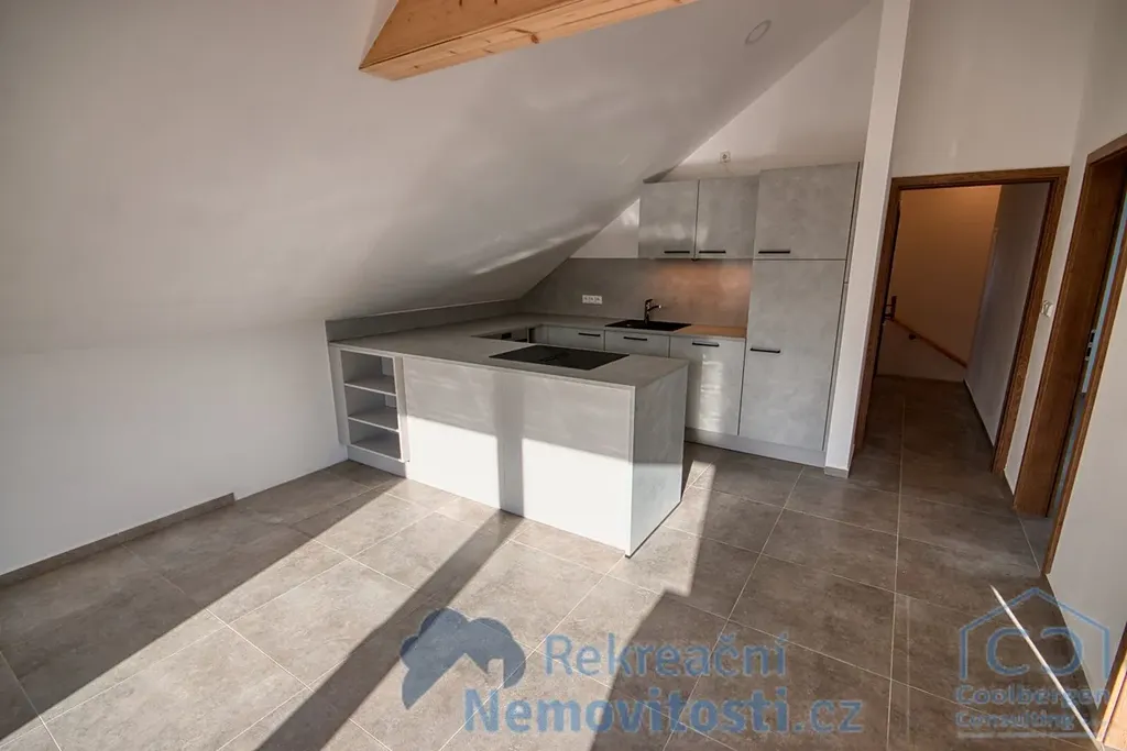 **Podkrovní byt (2.NP) s dispozicí 3+kk, s užitnou plochou 74,58 m2, s balkonem (5,6 m2), v domě se třemi bytovými jednotkami.**