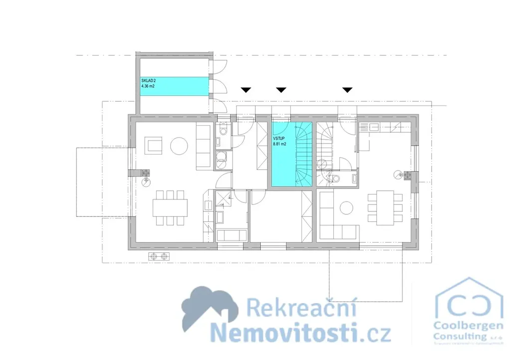 Z chodby (3,78 m2) se samostatně vstupuje do každé místnosti - na pravé straně do koupelny (8,51 m2) a toalety (2,49 m2), na levé straně pak do ložnice (12,62 m2). Chodba dále pokračuje do obytného prostoru (24,16 m2), ze kterého se vchází do druhé ložnice (13,91 m2).