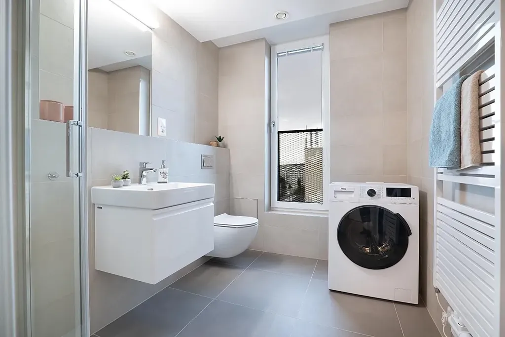 Byt je také vybaven mopem, vysavačem, žehlícím prknem a žehličkou, na oknech jsou instalovány žaluzie a záclony.