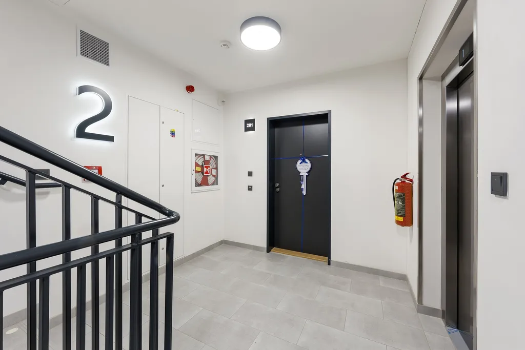 Byt je proveden ve vysokém standardu s důrazem na kvalitu materiálů i praktické využití prostoru. Vstupní část je vybavena bezpečnostními protipožárními dveřmi značky Sapeli a videotelefonem. Interiér doplňují elegantní interiérové dveře Sapeli. Byt je vybaven moderní kuchyňskou linkou včetně vestavných spotřebičů: varné desky, digestoře, trouby, myčky, lednice, mrazáku a mikrovlnné trouby, dále je zde moderní obývací stěna.