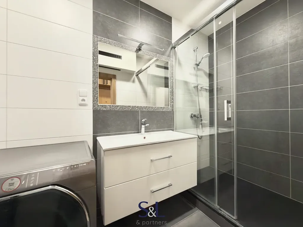 Koupelna působí velmi čistým a moderním dojmem, disponuje sprchovým koutem a je v ní umístěna pračka s přípravou pro instalaci sušičky.