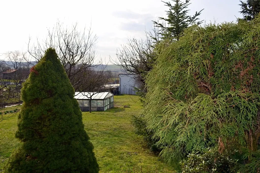 Zahrada je hezky udržovaná, má výměru 1959 m2, je zde skleník, záhonky, vzrostlé a plodící ovocné stromy.