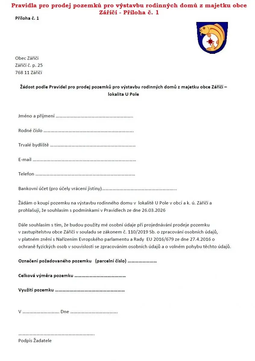 Záměr prodeje pozemků - Obec Záříčí