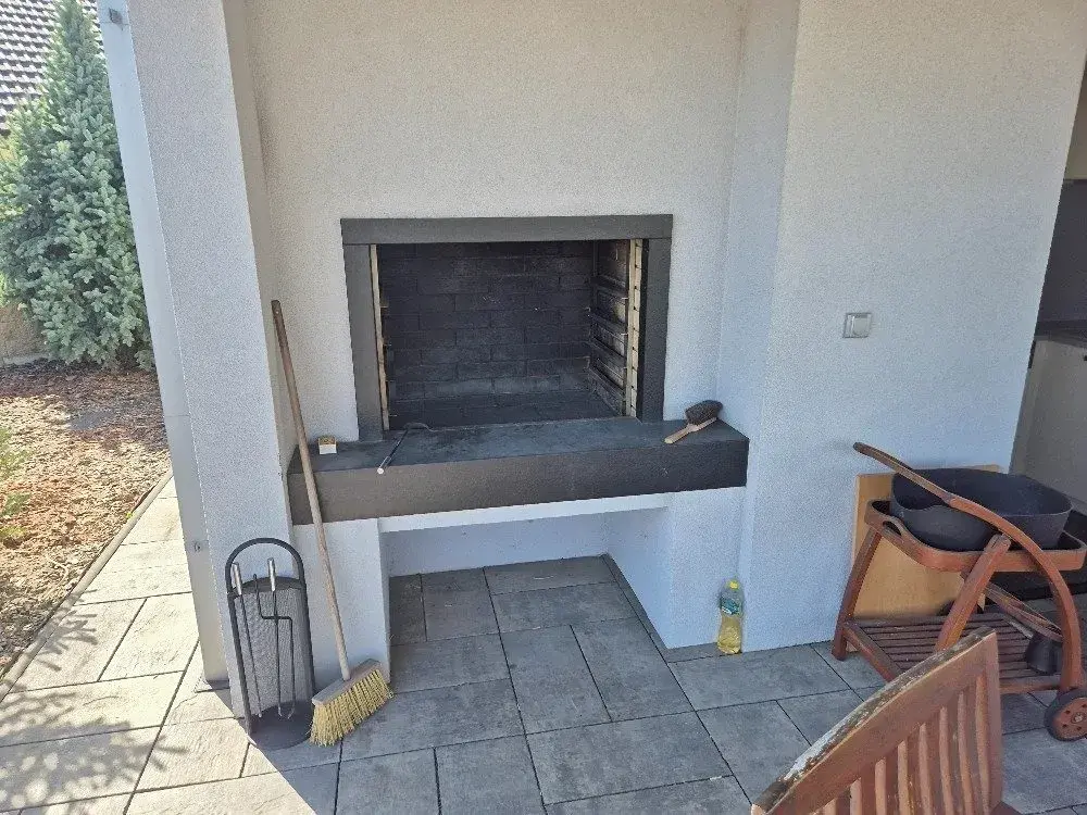 Na pozemku se dále nachází vedlejší stavba - zahradní domek s kuchyňkou, WC, zázemím bazénu a skladem, a bazén s ohřevem tepelným čerpadlem.