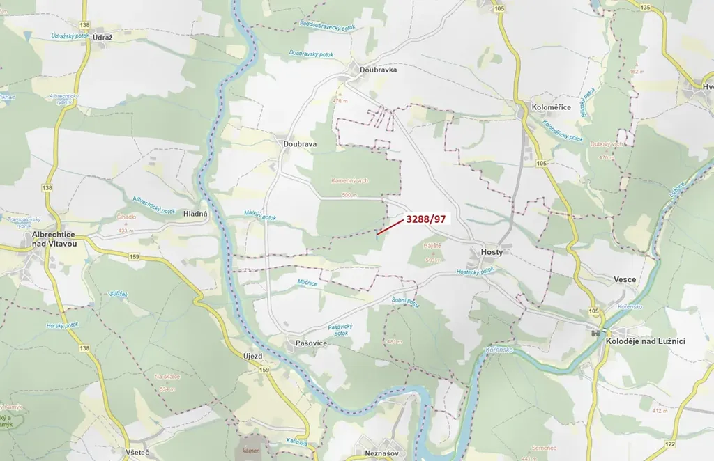 Lesní pozemek o výměře 1729 m2, parcelní číslo 3288/97, podíl 1/1, katastrální území Hosty, obec Hosty, obec s rozšířenou působností Týn nad Vltavou, okres České Budějovice, Jihočeský kraj. Po těžbě.