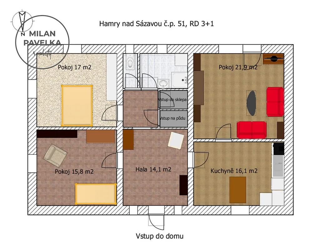Po vstupu do haly, kde je umístěn krb, se otevřou vstupy, vlevo do pokoje, vpravo do kuchyně a také do chodby kde je vstup do druhého pokoje, na WC a do koupelny. Přes kuchyni je vstup do obývacího pokoje. Celková podlahová plocha domu je dle podkladů a přiloženého půdorysu 95 m². Dům je podsklepený a jsou zde 3 místnosti o výměře 37 m². K podkroví je již připravena dokumentace a jsou zde plánovány 4 pokoje o podlahové ploše 66,5 m² + sociální zařízení.