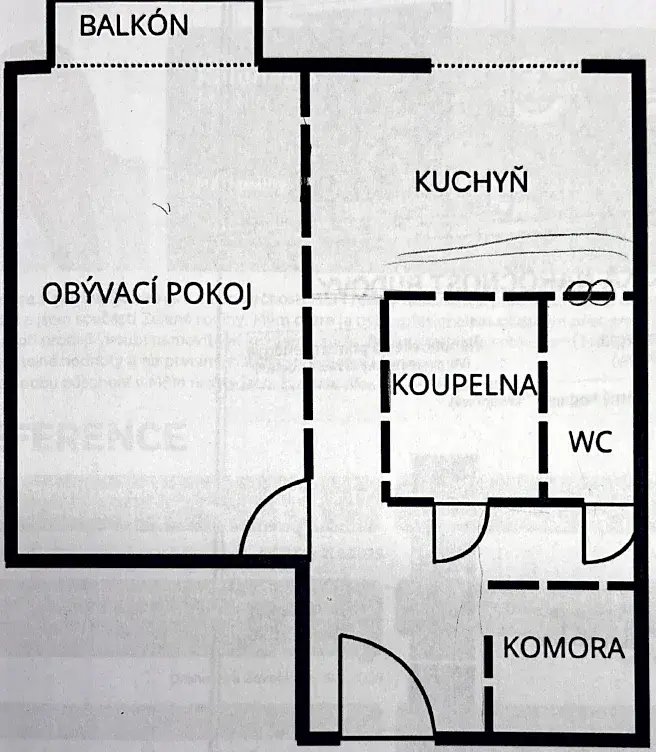 V kuchyni je elektrický sporák s troubou, lednice, mikrovlnná trouba. Jídelní stůl se dvěma židlemi. Potravní odvětrávaná skříň. K bytu přísluší sklepní kóje.
