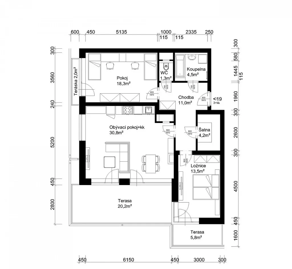 Dispozice bytu tvoří prostorný obývací pokoj s kuchyňským koutem a vysokými stropy, dále ložnice, dětský pokoj a praktická šatna. Samozřejmostí je samostatné WC a koupelna s vanou.