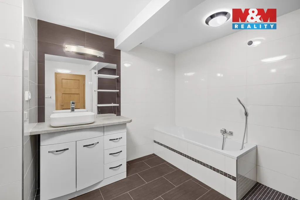 Součástí bytu je prostorná koupelna s vanou i sprchovým koutem, přičemž toaleta je samostatná.