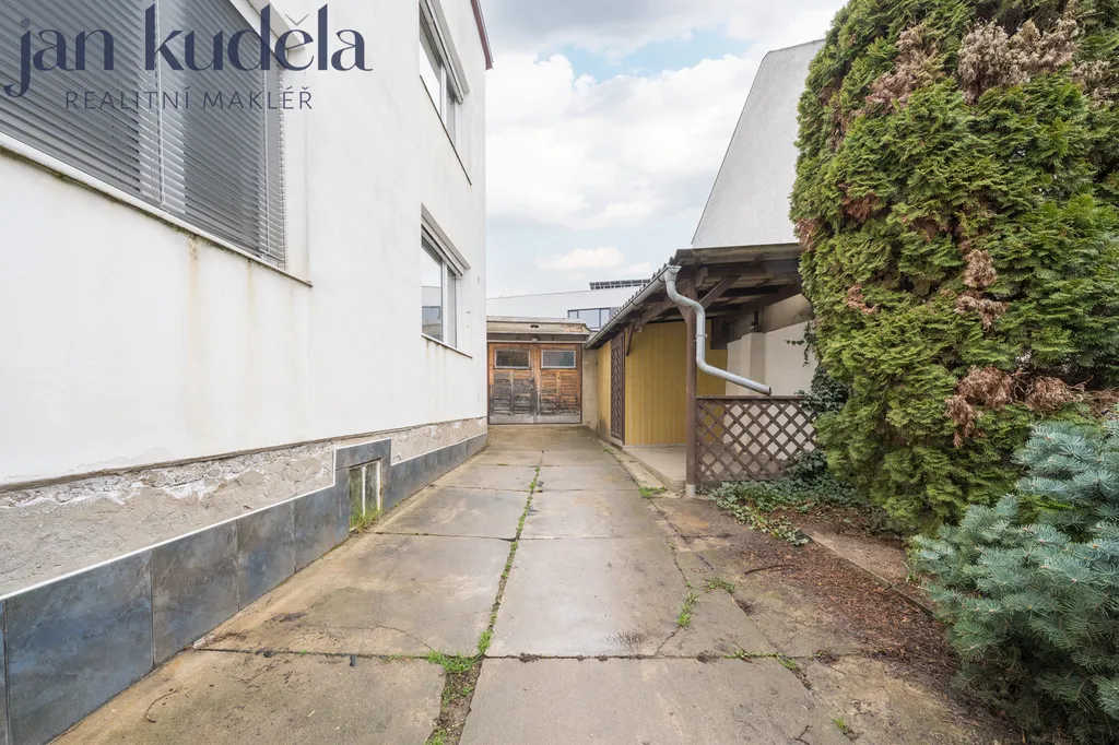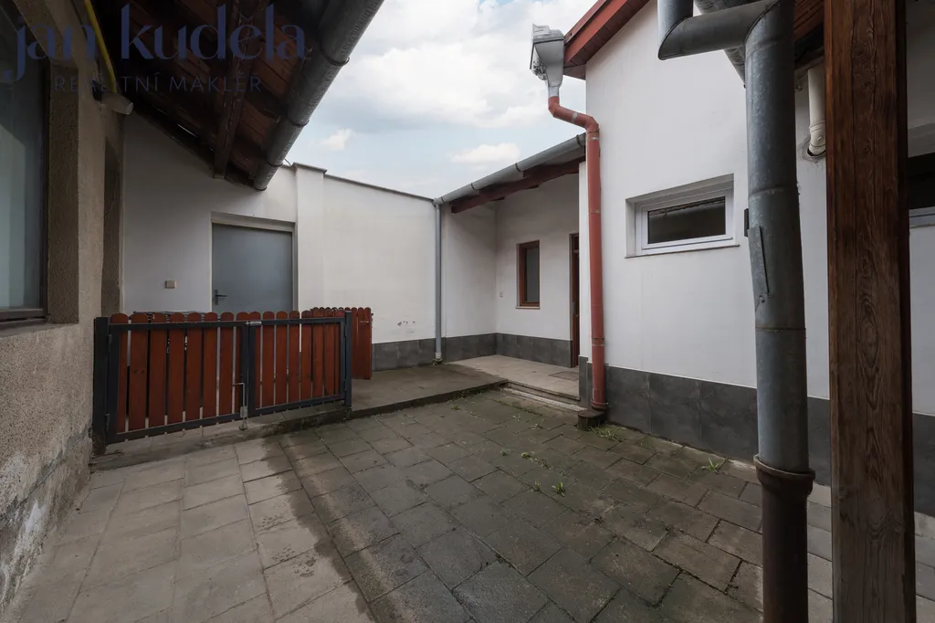 Při vstupu do domu se ocitnete v uzavřeném dvorku, odkud je přímý vstup do obytné části domu. Z dvorku je zároveň přístup do dílny, ze které lze dále projít na zahradu a do garáže (výška 1,8 m, šířka 2,3 m).
