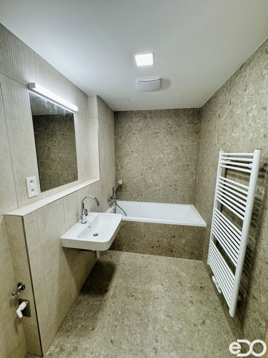 Byt se nachází v cihlové novostavbě a čeká na své první nájemníky. Moderní dispozice nabízí prostorný obývací pokoj s kuchyňským koutem, ložnici, předsíň, koupelnu s vanou a samostatnou toaletu s umyvadlem. Z obývacího pokoje i ložnice je vstup na lodžii o výměře 7,6 m², která poskytuje příjemné místo k relaxaci. Jednotka je orientována na jihozápadní stranu. Součástí bytu je krásná a moderní kuchyňská linka, která je vybavena veškerými spotřebiči: elektrická trouba, indukční varná deska, digestoř, myčka a lednice s mrazákem. V ložnici je k dispozici prostorná vestavěná skříň, v předsíni pak vestavěný botník s věšáky. Vytápění je zajištěno tepelným čerpadlem, stejně jako ohřev vody. Okna a dveře k lodžii jsou hliníková, podlaha pak vinyl a keramická dlažba. K bytové jednotce dále náleží zděný sklep (2,7 m²) a garážové stání, které je za příplatek 1 800 Kč měsíčně.