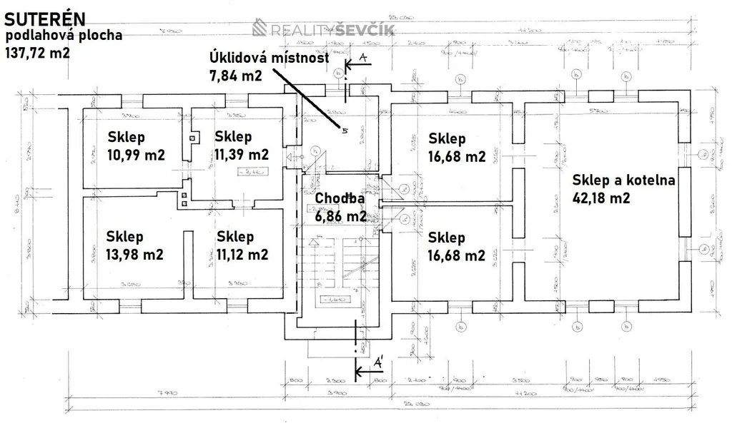 Suterén (137 m²): skladovací prostory, výměníková stanice, technické zázemí, úklidová místnost