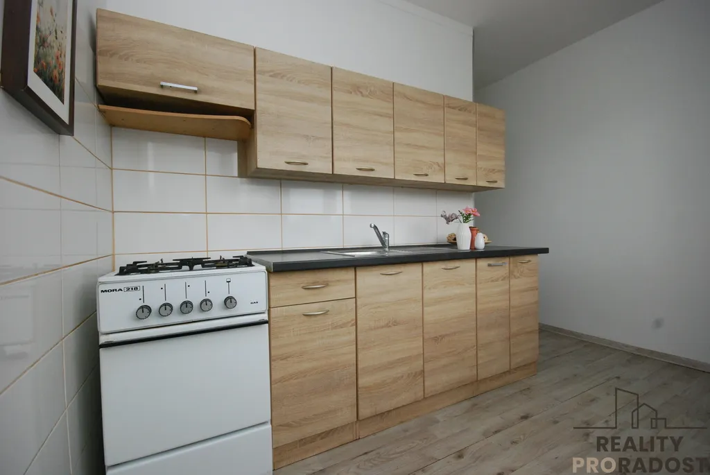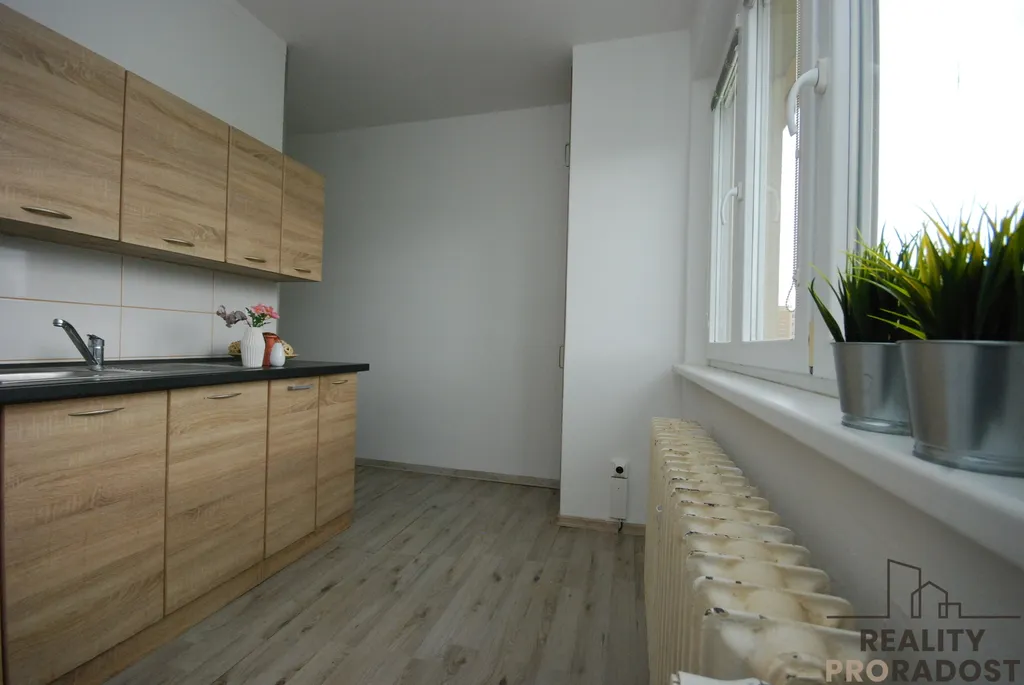 V bytě je zánovní kuchyňská linka, dveře, opravená koupelna a WC.