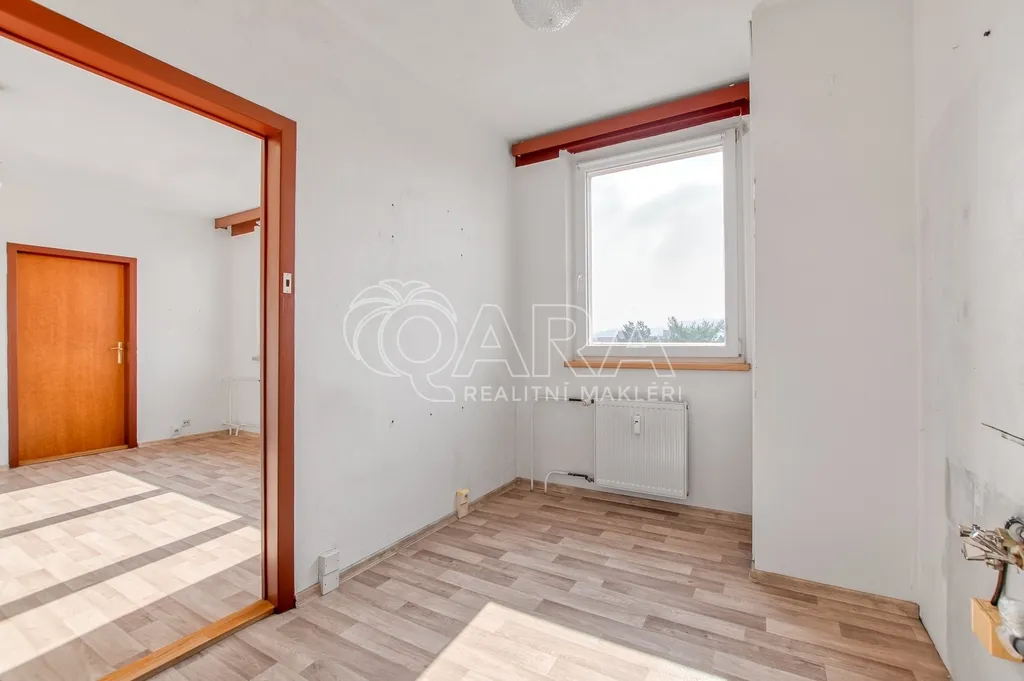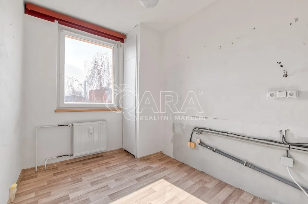 Kuchyňská linka je zde už odstraněná. Díky tomu vás nečeká žádné bourání staré plechové klasiky, která se v těchto bytech často objevuje a rozvody vody jsou připravené v plastu, takže máte o kus práce méně a můžete rovnou řešit finální podobu podle sebe.