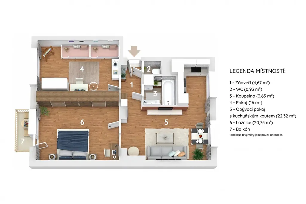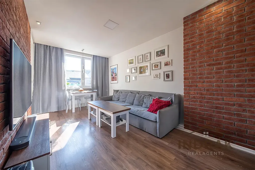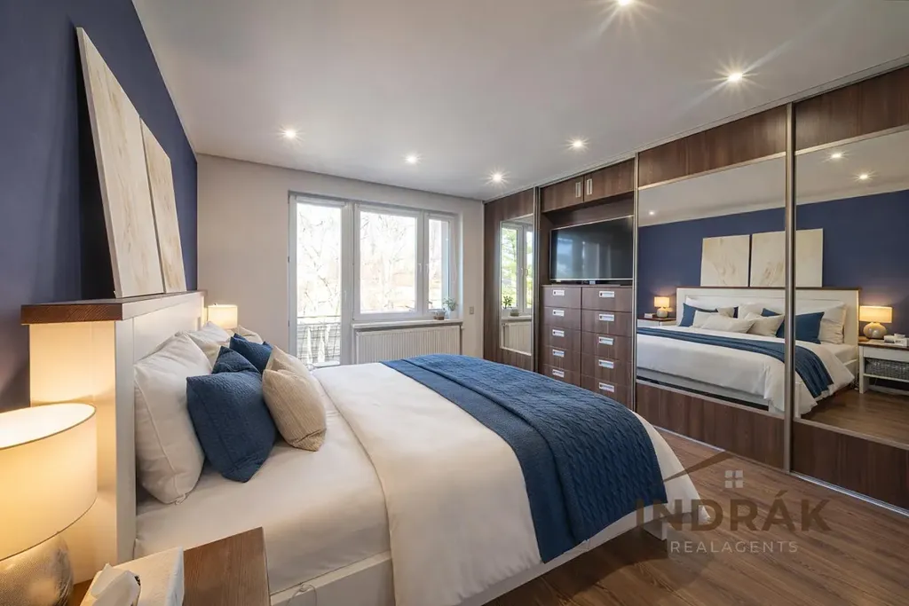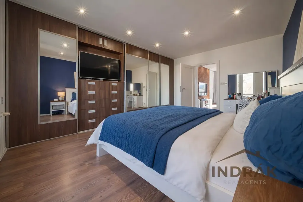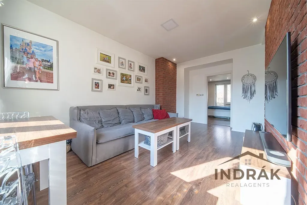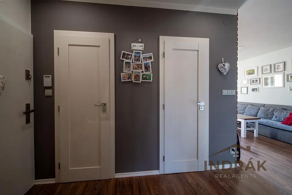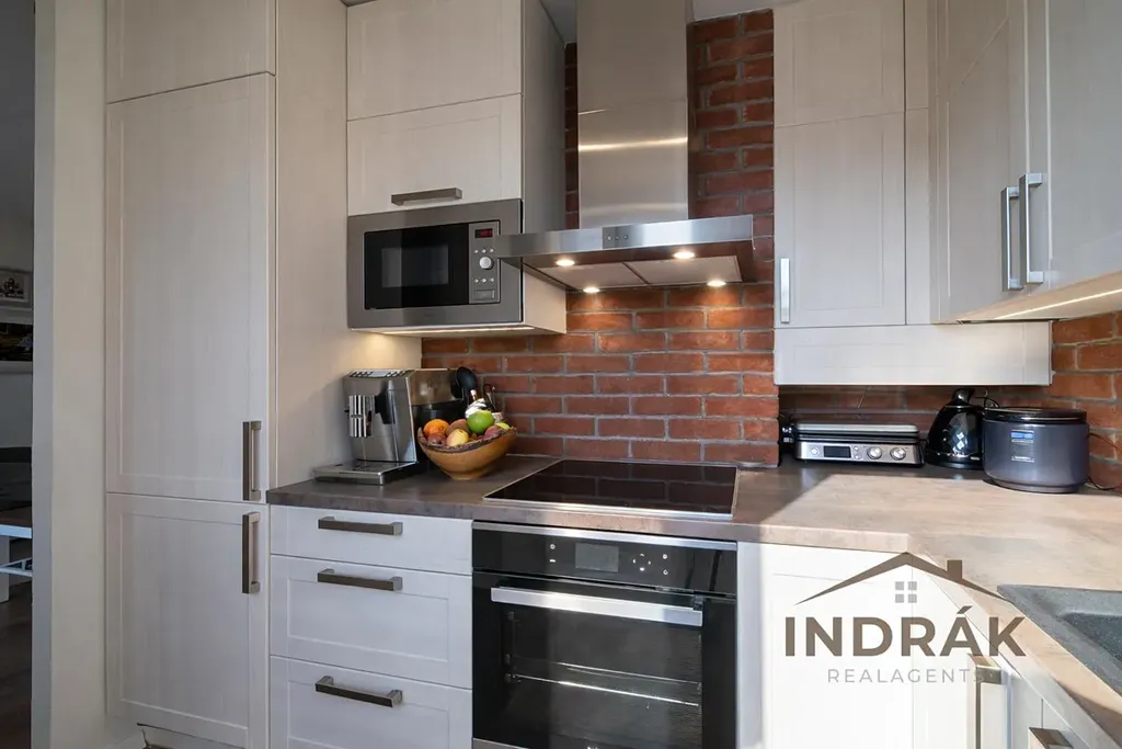 Byt zaujme již při vstupu svou harmonickou atmosférou a promyšleným dispozičním řešením. Dominantou interiéru je obývací pokoj s designovou cihlovou stěnou, která dodává prostoru moderní a nadčasový charakter. Samostatná kuchyň je vybavena praktickou kuchyňskou linkou s dostatkem úložného i pracovního prostoru a navazuje na jídelní část. Kuchyň je vybavena horkovzdušnou troubou, indukční varnou deskou, vestavěnou lednicí s mrazákem a myčkou.