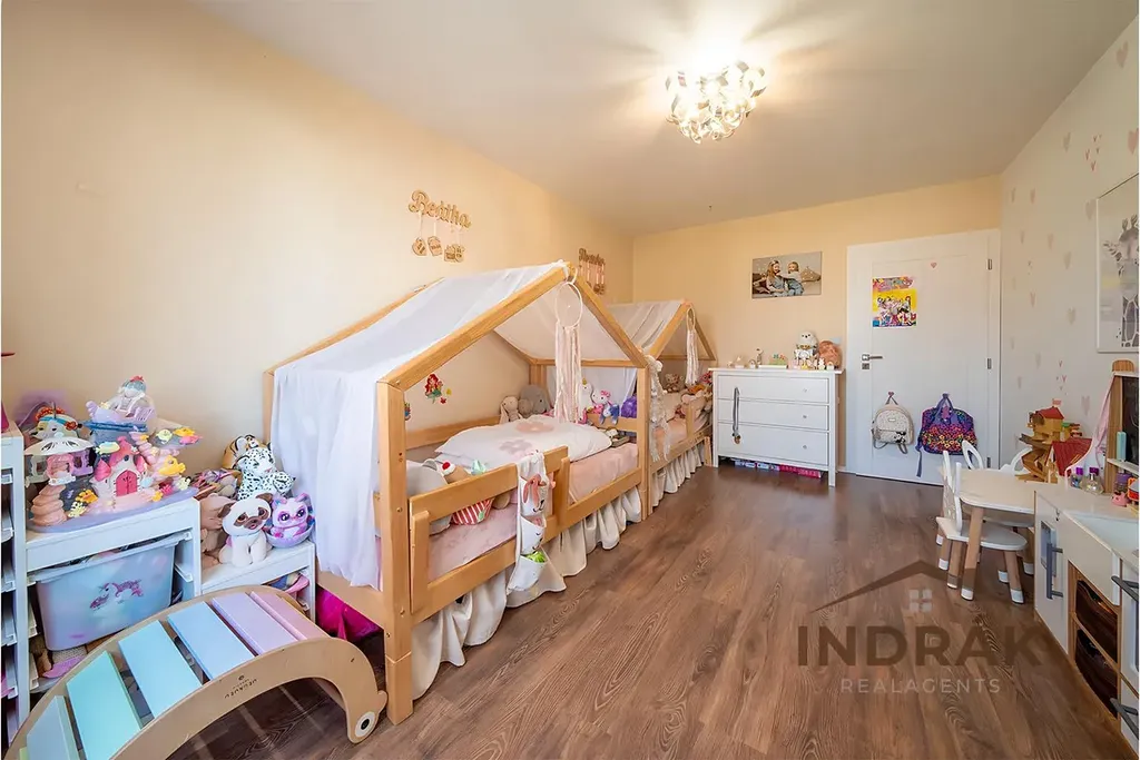 Další dva pokoje nabízejí variabilní využití ideální jako ložnice, dětský pokoj či pracovna. V celém bytě jsou vkusně sladěné materiály, plovoucí podlahy a dostatek úložných prostor včetně vestavěných skříní.