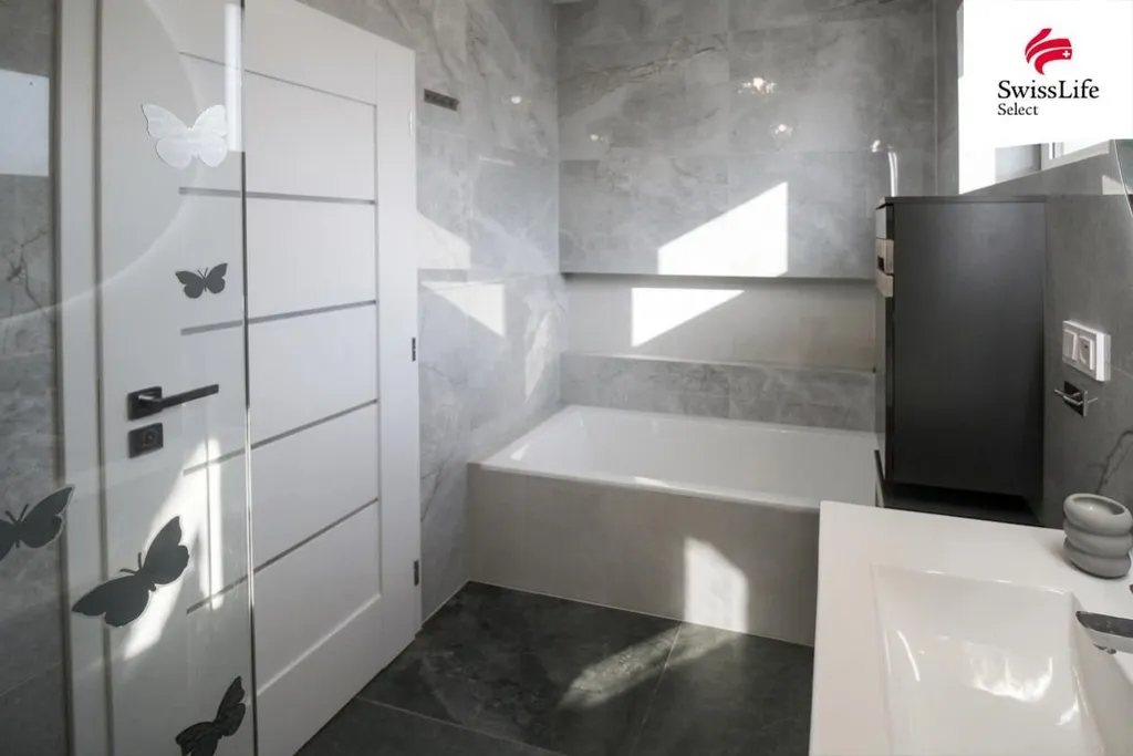 Z centrální chodby se pohodlně vstupuje do tří samostatných neprůchozích pokojů, do koupelny, která nabízí jak vanu pro relaxaci, tak sprchový kout pro rychlé ranní tempo,