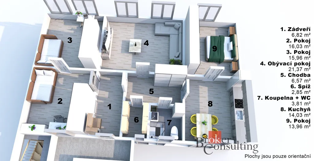Uvedené výměry jsou orientační. Veškeré zveřejněné údaje mají pouze informativní charakter a nepředstavují nabídku ve smyslu § 1731 nebo § 1732 občanského zákoníku, ani veřejný příslib dle § 1733 občanského zákoníku.