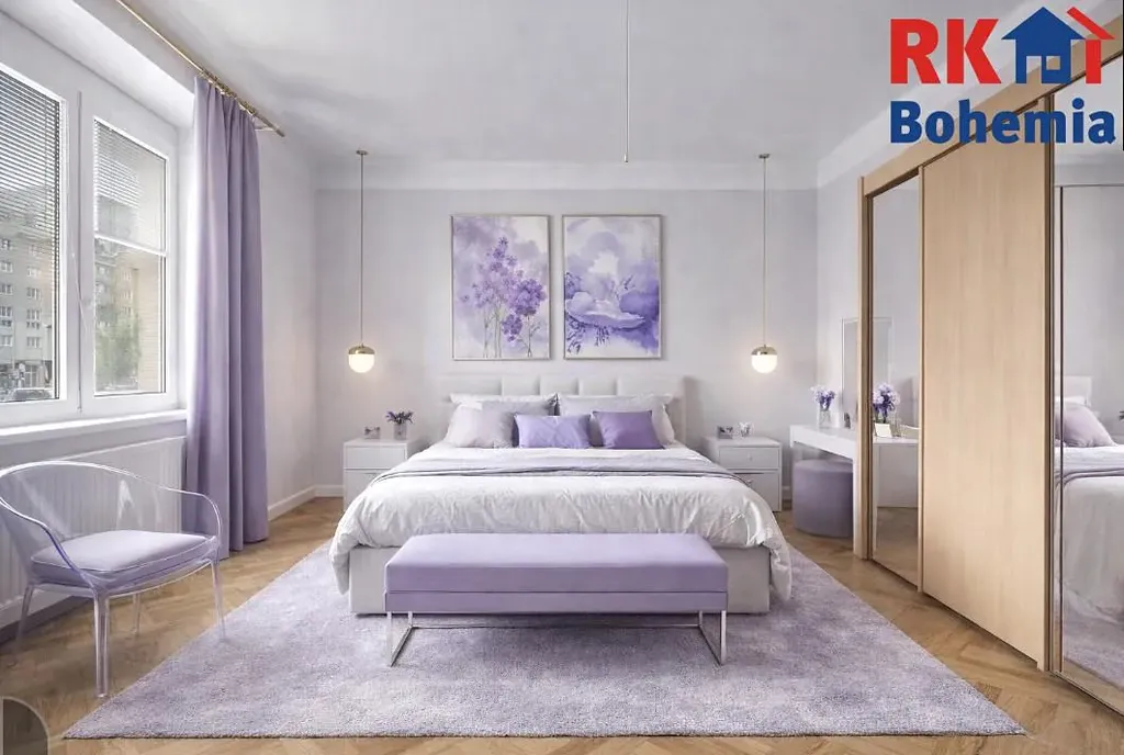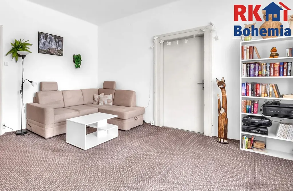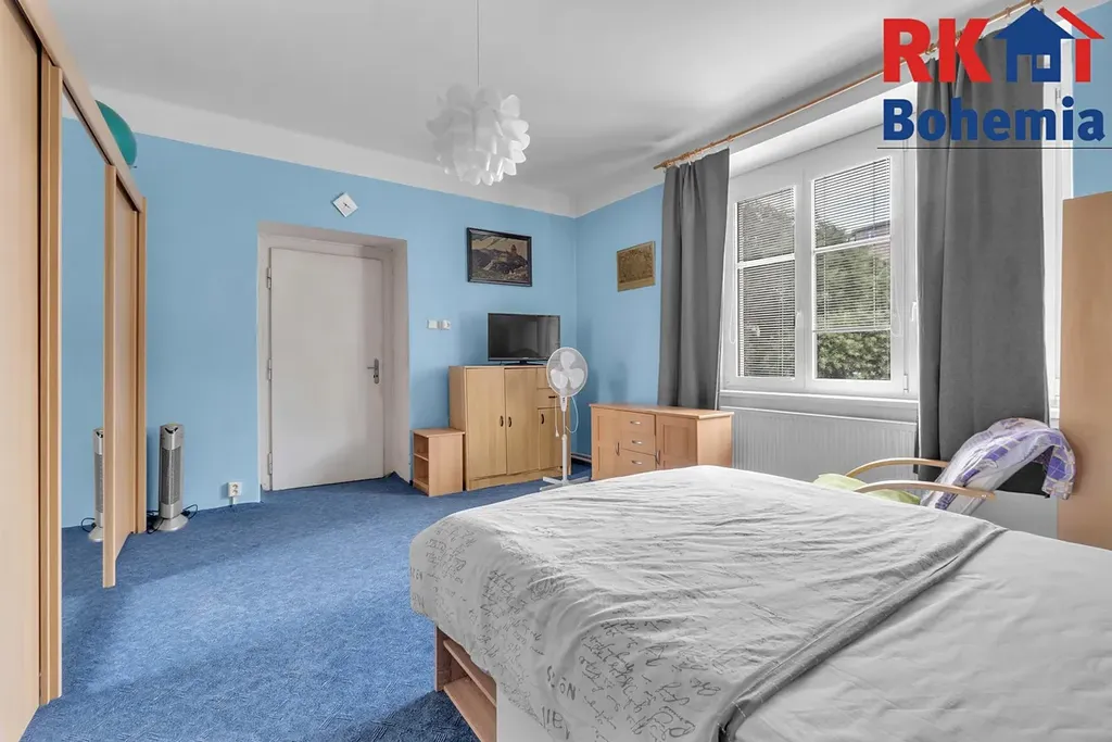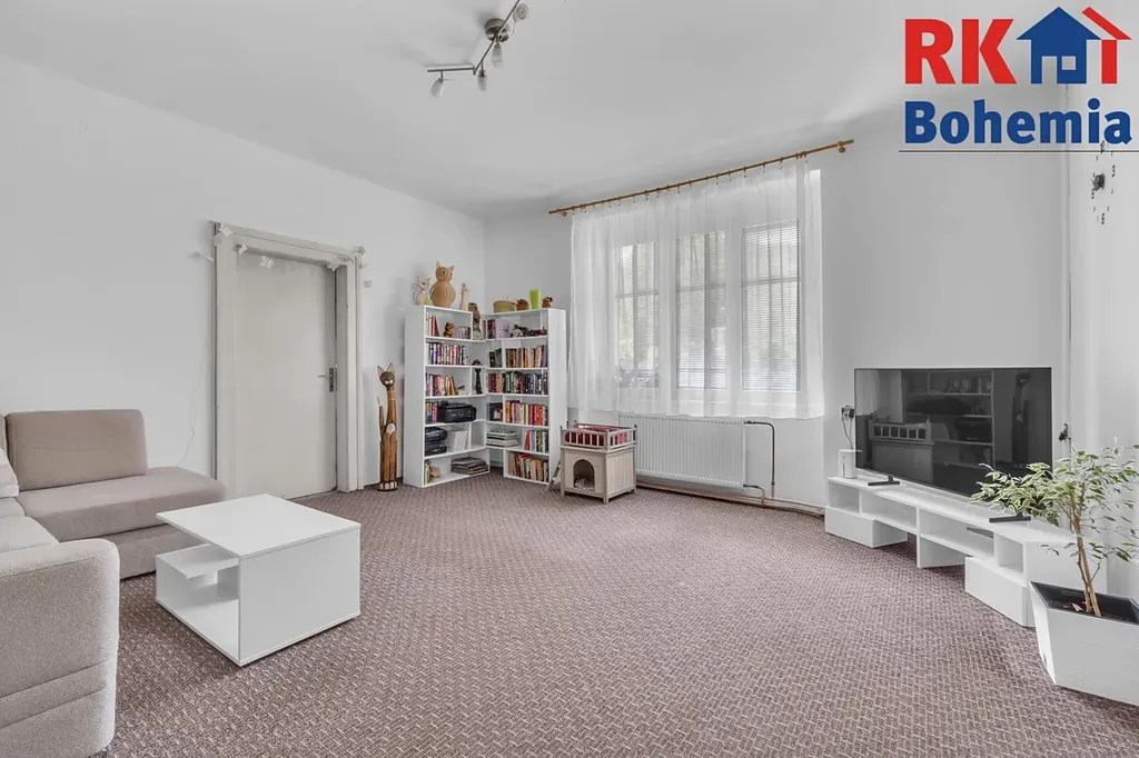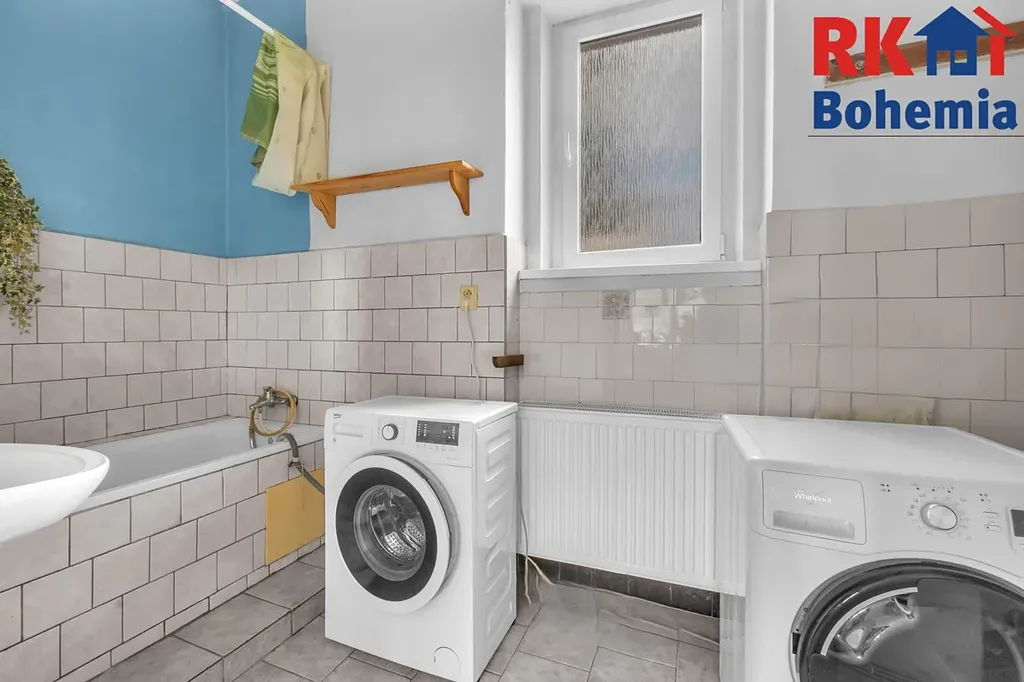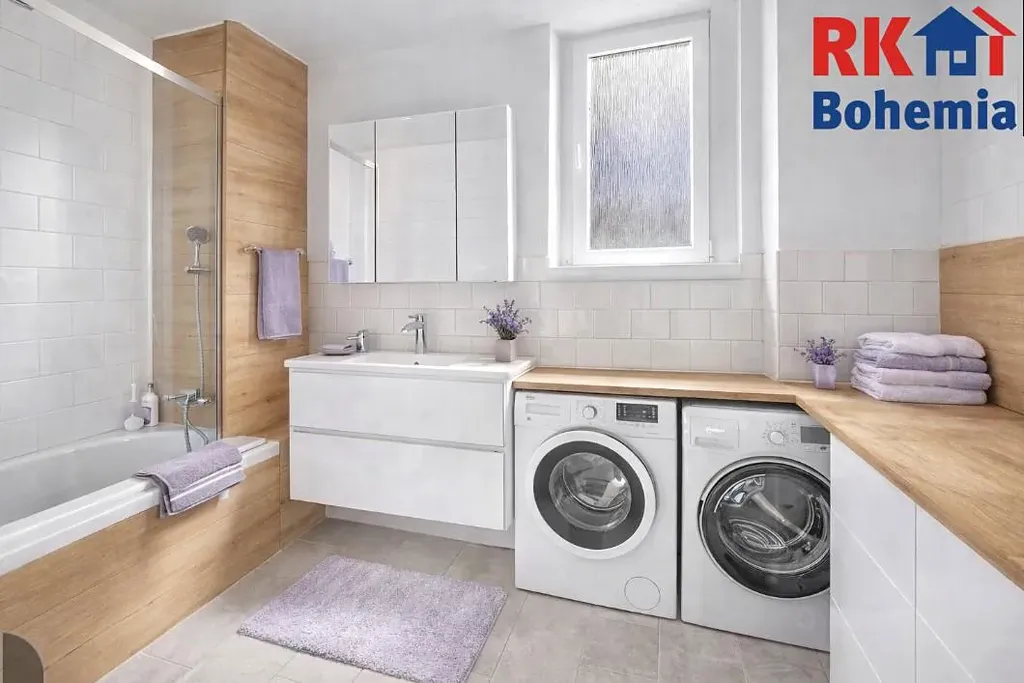 Dále zde naleznete velký obývací pokoj, dvě ložnice, přičemž za jednou z nich je druhá koupelna s vanou a dostatečným prostorem pro pračku a sušičku. Praktickým benefitem je velká komora, kterou lze snadno přetvořit na pracovnu či další pokoj.