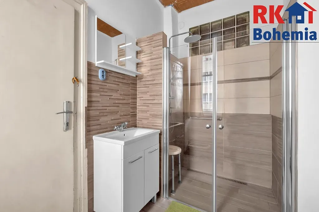 Dispozice nabízí prostornou vstupní chodbu, samostatnou kuchyni, na kterou navazuje koupelna se sprchovým koutem.