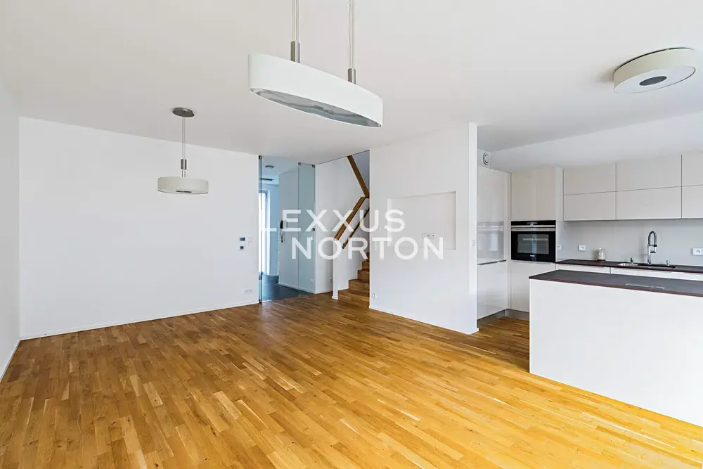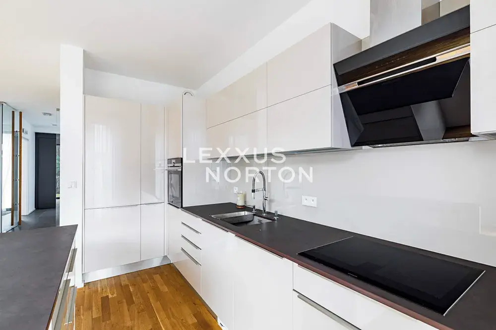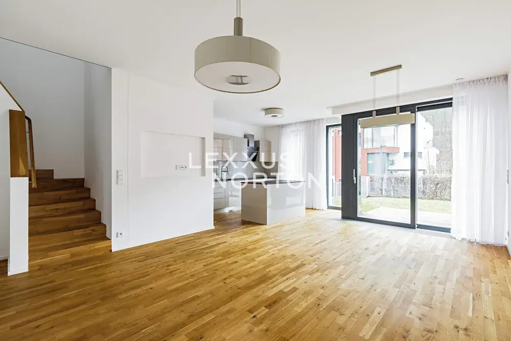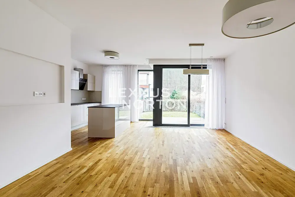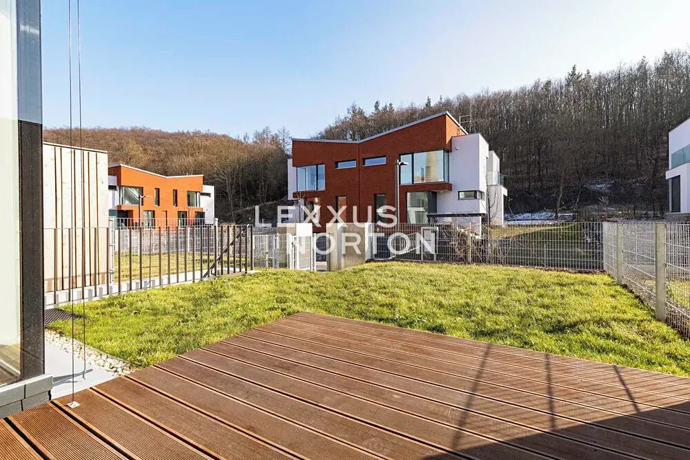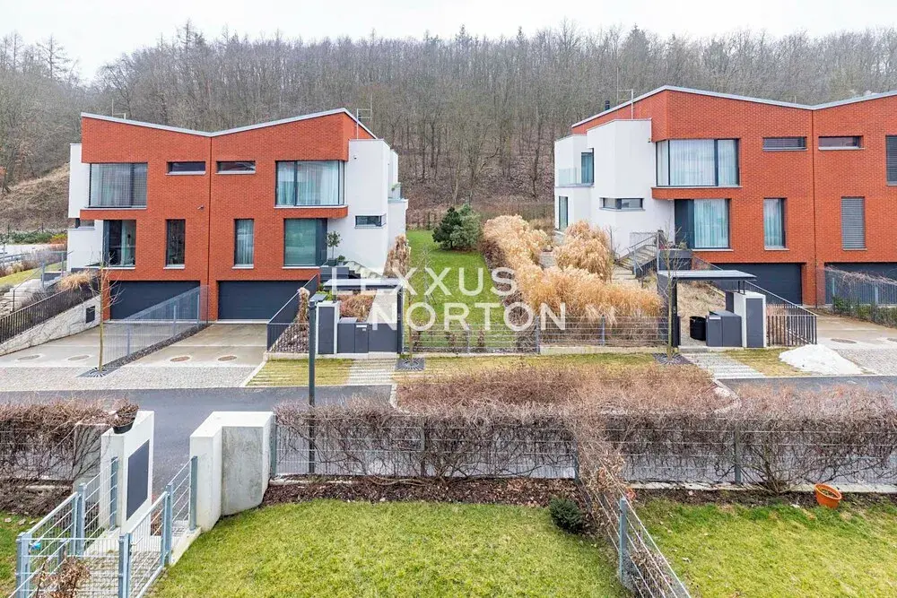 Nemovitost v přízemí nabízí k užívání vstupní halu, obývací pokoj s kuchyňským koutem a jídelním prostorem s přímým vstupem na terasu a zahradu, ložnici a koupelnu. V patře další 3 ložnice, 2 koupelny, šatnu a balkon. Suterén je tvořen technickou místností, prádelnou a fitness místností. K domu náleží rovněž garáž pro dva vozy.