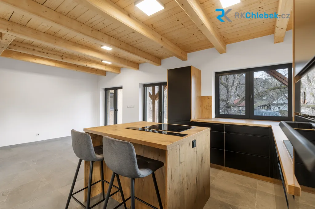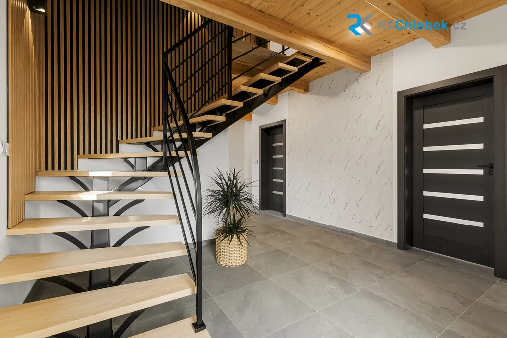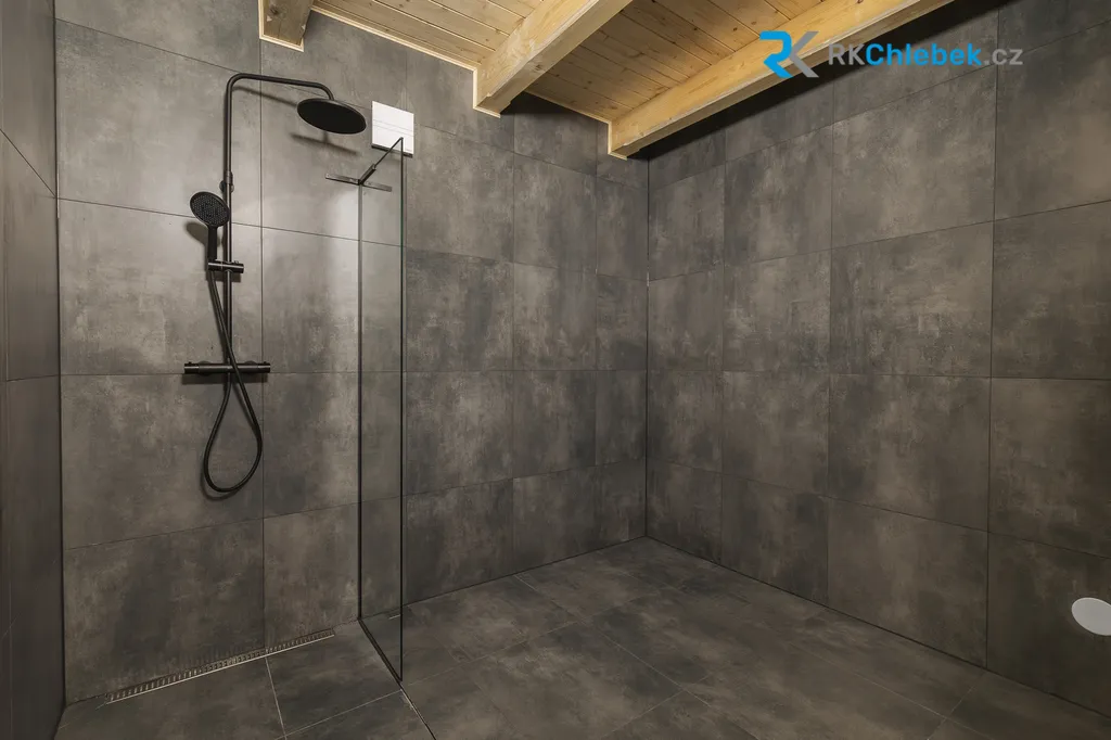 Dominantou celého domu je designová kuchyň, kde se setkává špičkové řemeslo s moderními technologiemi. Vestavěné spotřebiče, promyšlené odvětrávání a kvalitní materiály vytváří prostor, kde je radost trávit čas. Každý detail interiéru byl navržen s citem pro kvalitu a estetiku - velkoformátové obklady a prémiová sanita od SIKO, dubové podlahy v horním patře a dlažba v přízemí, interiérové dveře v kombinaci dubu a antracitu, dominantní schodiště z jasanu s kovovým zábradlím. Pro maximální komfort je v celém domě podlahové vytápění (včetně horního patra) a každá místnost má vlastní termostat – ideální kombinace pohodlí a úspory. Součástí interiéru je také koupelna s velkorysým prostorem, který je připraven pro instalaci soukromé sauny. Tento promyšlený detail vám dává možnost dotvořit si vlastní wellness zónu přesně podle vašich představ a posunout tak komfort bydlení na ještě vyšší úroveň.