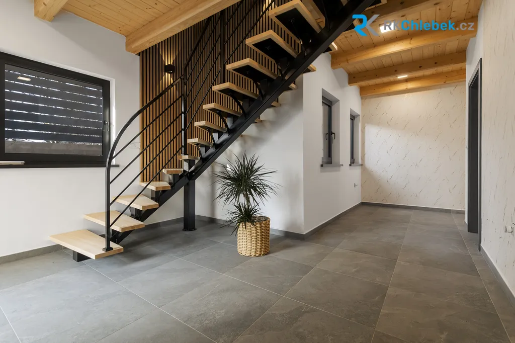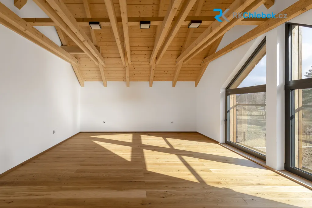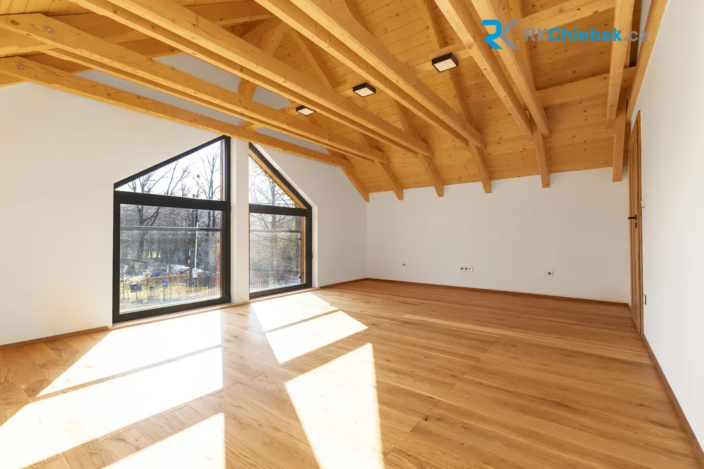 Elegantní architektura je podtržena unikátním dřevěným obkladem z pálené borovice, který domu dodává nadčasový charakter a výjimečnost. Hliníková okna s izolačním trojsklem a designovými venkovními žaluziemi v antracitovém provedení zajišťují nejen maximální komfort, ale i estetický zážitek. Kvalitní vícevrstvá střešní konstrukce (typ Jánošík) s dvojitou dřevěnou vrstvou a zesílenou izolací zajišťuje výjimečnou energetickou efektivitu domu, kterou elegantně doplňují solární panely určené pro ohřev vody. Dům je připraven i na budoucnost – s možností instalace tepelného čerpadla díky již připraveným rozvodům.