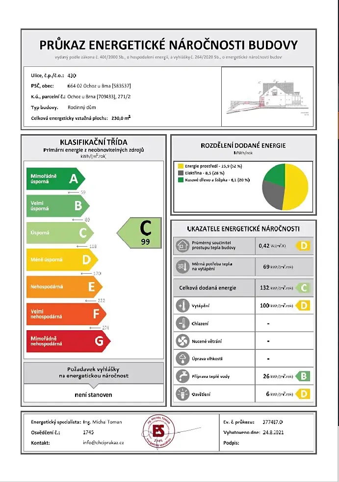 • podlahové vytápění, dřevěné dveře a obložky, dřevěná eurookna, PENB C