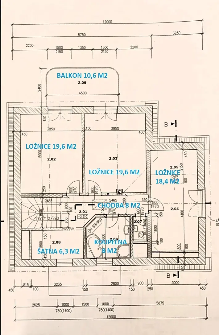 První patro je určeno klidové zóně, jsou zde 3 prostorné ložnice (19,6 m2, 19,6 m2 a 18,4 m2), koupelna s vanou i sprchovým koutem, samostatné WC, šatna a balkon do zahrady.
