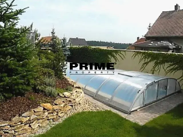 Součástí domu je dvougaráž s přímým vstupem do domu. U domu je zahrada (512m2) s venkovním krytým vyhřívaným bazénem.